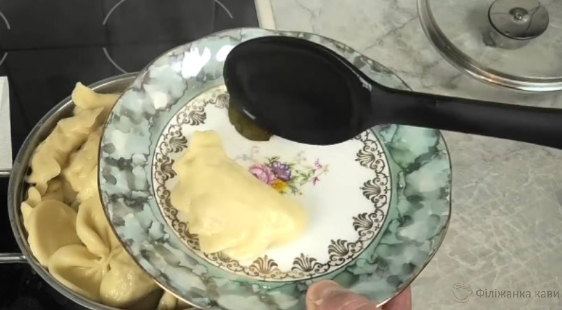 Виловіть вареники шумівкою і складіть у миску. Тепер накрийте тарілкою або кришкою та злийте рідину, що залишилася всередині. Змастіть вареники вершковим маслом.
