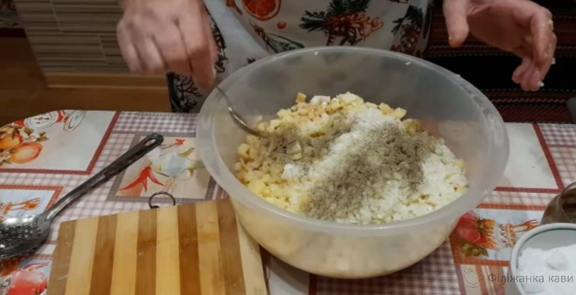 Очистіть картоплю та наріжте невеликими кубиками. Дрібно наріжте цибулю і змішайте з картоплею, посоліть і поперчіть, перемішайте.