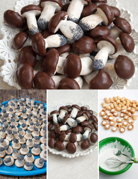 До одного білка додати 200 г цукрової пудри добре все перемішати. Заповнити дирочки в шляпках і вставити туди ніжки положити щоб підсохло десь приблизно на одну годину. Білок накрити плівкою щоб не засихав. Коли ніжки підсохнуть у білок додати лимонного соку або трішки води зробити його рідшим. Силіконовою кісточкою нанести білок на низ шляпки і на ніжку, низ ніжки вмочити в мак і положити щоб підсохло. Розтопити шоколад з олією і кожну шляпку вмочити в шоколад положити щоб знову підсохло. Ну нарешті і все. Втомились? А тепер смакуйте 😋