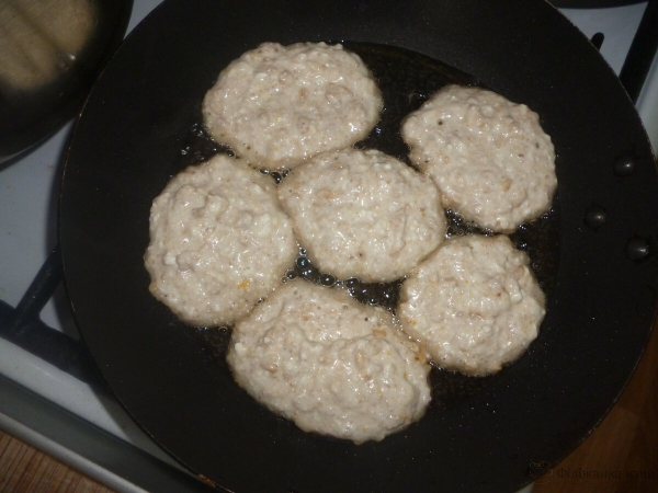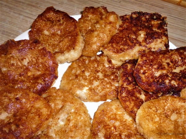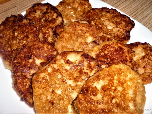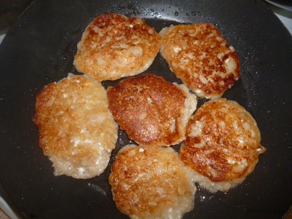 Викладаємо партію в розігріту олію, зменшуємо вогонь до трохи нижче середнього, накриваємо кришкою. Як тільки верх «схопиться», перевертаємо оладки і смажимо під кришкою на іншій стороні до рум’яної скоринки.
