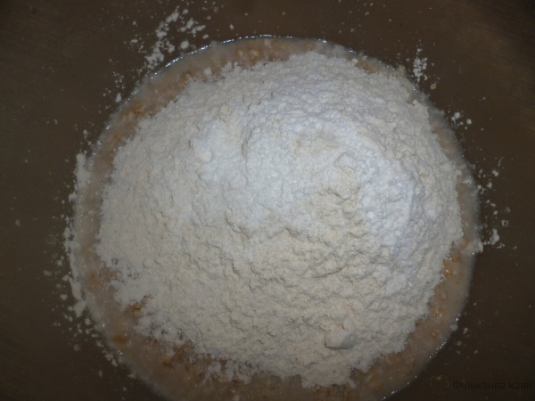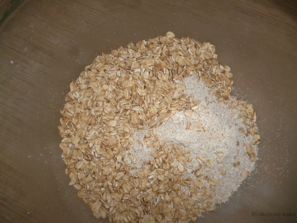 У набряклу вівсянку просіюємо борошно і розпушувач.