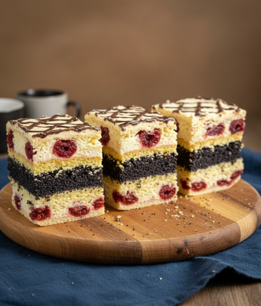 Перемащувати так: вишневий-маковий-вишневий коржі.