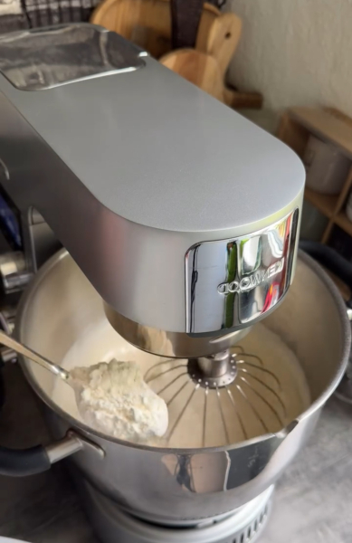 У збиту яєчну масу по трохи вводимо борошно і розпушувач перемішуємо на найменших оборотах міксера.