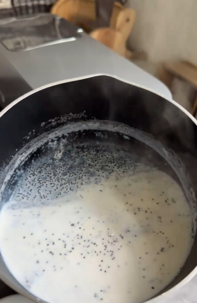 Мак відправляємо в сотник з молоком і ставимо на вогонь, доводимо до кипіння.
