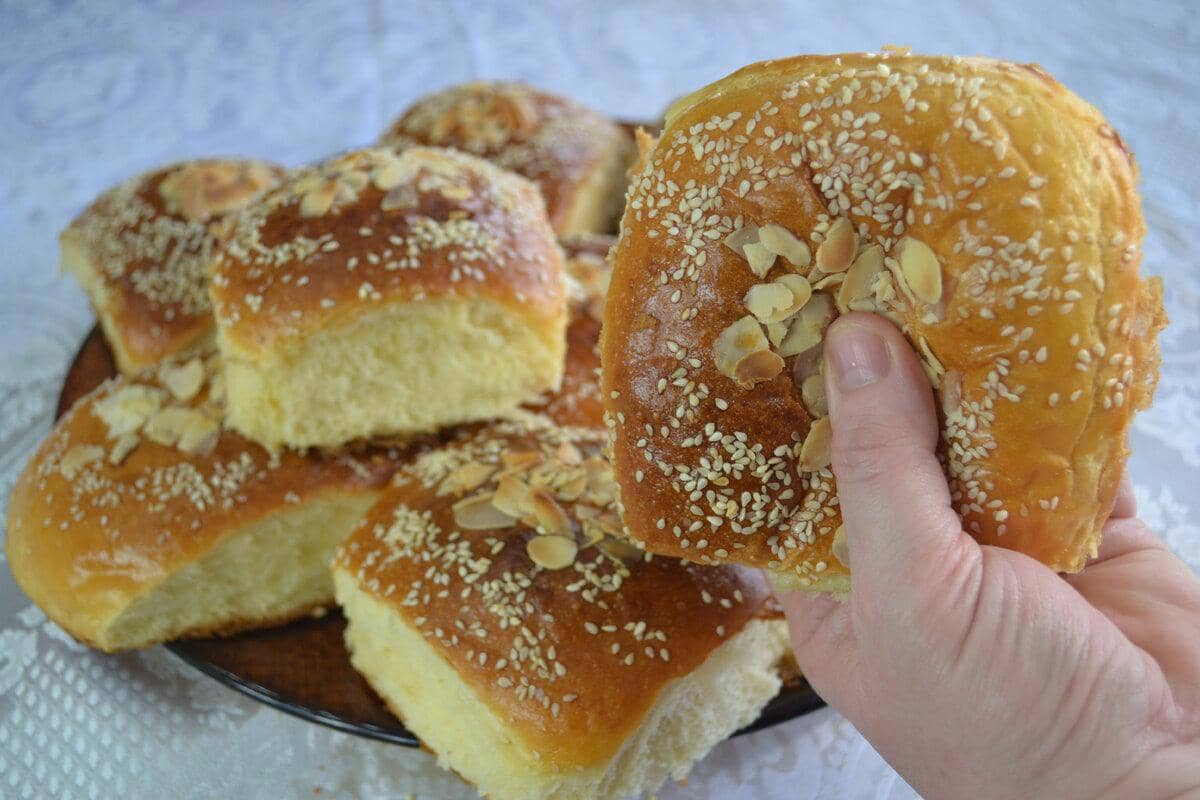Готові булочки змащуємо сумішшю з жовтка і молока, змащуємо булочки і посипаємо їх за бажанням кунжутом і мигдальними пелюстками. І відправляємо випікатися в заздалегідь розігріту духовку при 200 градусів 10 хвилин і 180 градусів ще 30 хвилин