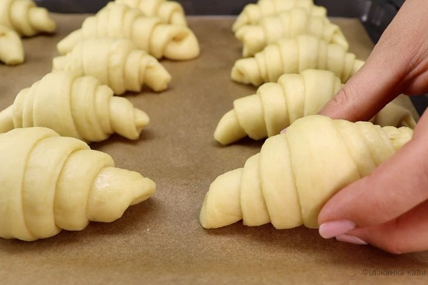 Формуємо грудку знову і вже розкачуємо великий пласт, з якого вирізаємо трикутники. Ці трикутники згортаємо у форму круасану і знову відкладаємо на 10 хвилин під харчовою плівкою або рушником.