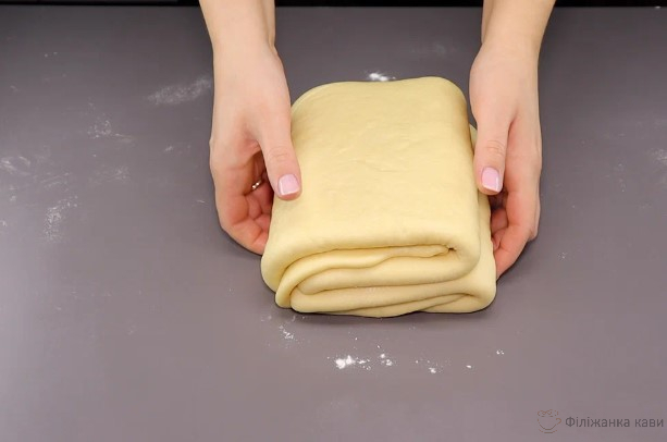 Далі розкачуємо у пласт шириною 4 мм, він повинен бути діаметром 65 см приблизно. Знизу робимо загин до центральної частини, загинаємо верх і кладемо внахлест на перший шар. З двох сторін робимо загини до центру та складаємо навпіл. Накриваємо тісто глибокою тарою на 15 хвилин.