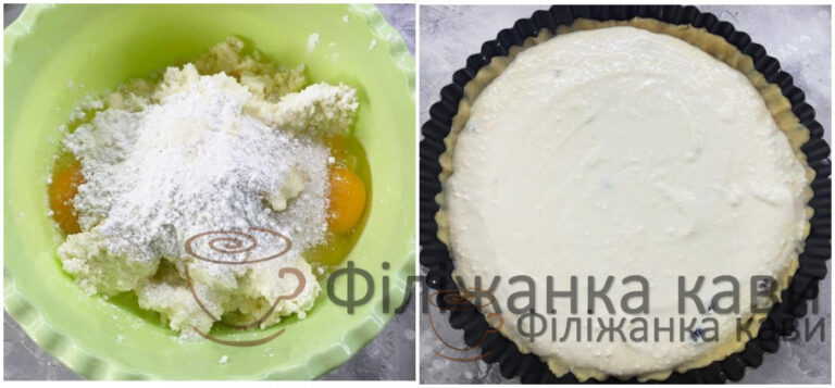 В окрему миску розбиваємо ще 2 яйця, додаємо до них 10 грамів ванільного цукру і 120 грамів цукру звичайного. Збиваємо віночком, слідом знову наливаємо 120 мілілітрів молока і додаємо столову ложку вершкового масла, а слідом просіюємо до суміші 250 грамів борошна і 2 чайні ложки розпушувача. Замішуємо майже рідке тісто.