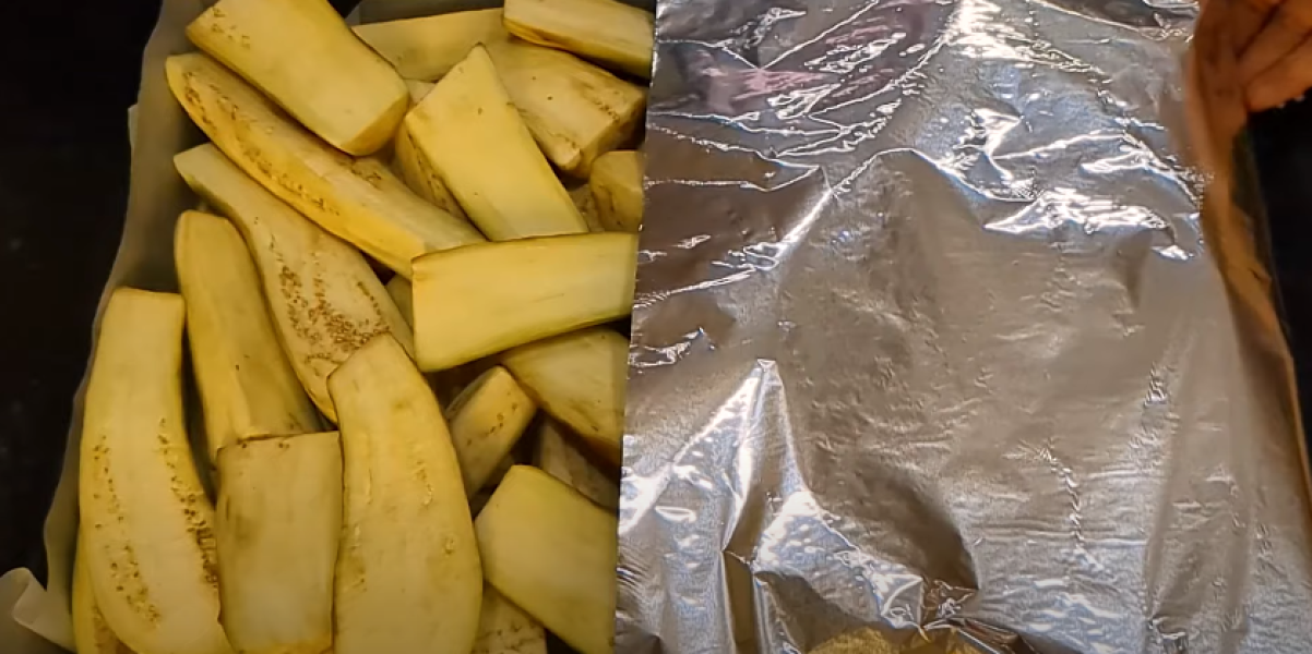 Перекладаємо баклажани на лист, застелений пергаментом. Закриваємо фольгою для рівномірного прогріву і ставимо запікатись у розігріту до 180 духовку на 40-50 хвилин. Можна запекти цілими, почистити та порізати.