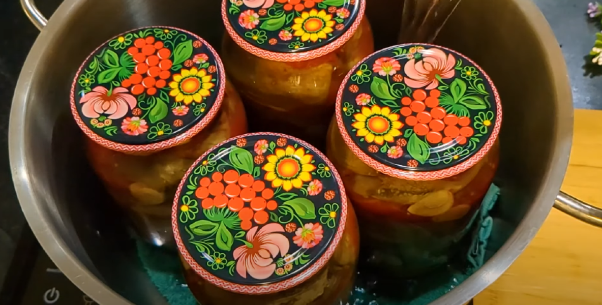 10. Каструля на плиті. На дно кладемо рушник або шматочок тканини. Встановлюємо банки у каструлю. Наливаємо теплу воду, для прискорення процесу, по плічка банок. Банки з кришками під закатування бажано придавити, овочі мають властивість під час кип’ятіння піднімати такі кришки.