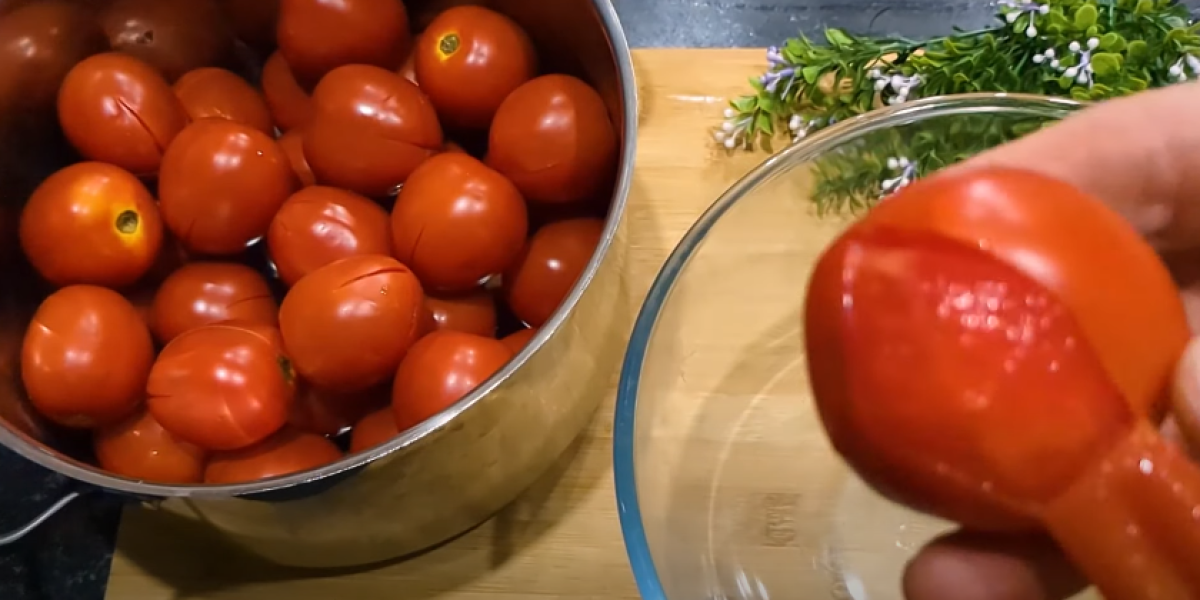 Помідори бажано щільні. У помідорів робимо зі зворотного боку надрізи ножем хрест на хрест. Заливаємо окропом помідори, даємо постояти.