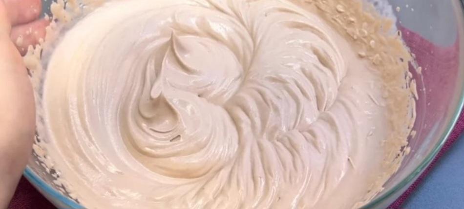 У чисту миску наливаємо вершки, додаємо цукрову пудру та шоколадну пасту, збиваємо міксером.