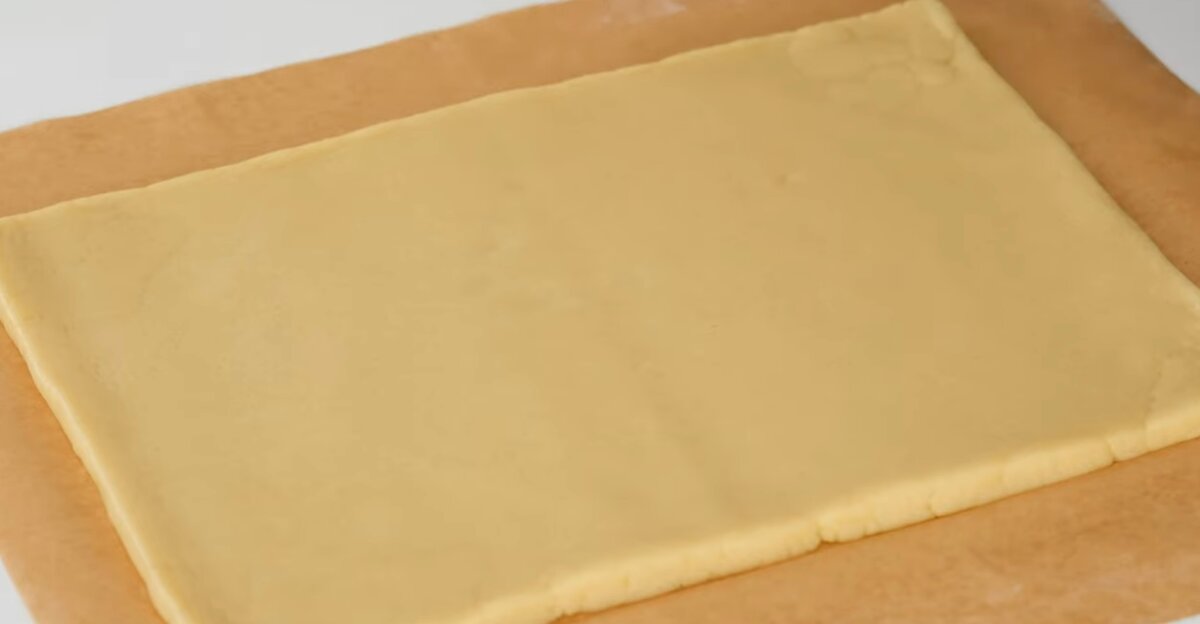 Пергамент посипаємо борошном і розкачуємо качалкою рівномірно масу. Робимо рівненькі краї, сформувавши прямокутник. Розмірами 22х32 см.