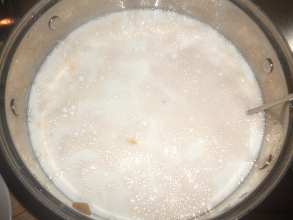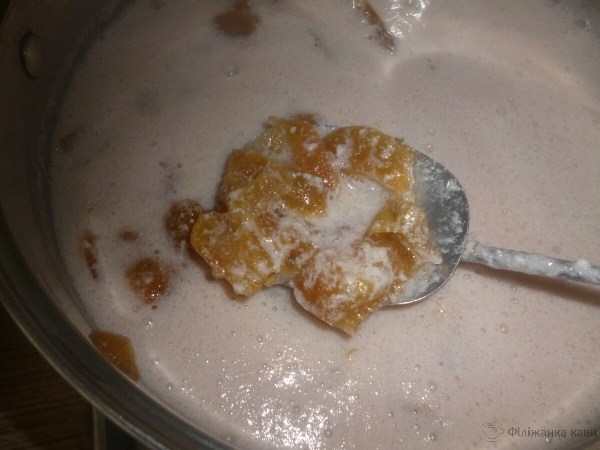 Коли в каструлі утворюється густа пюреподібна маса, відключаємо вогонь. Грудочки від молока можуть розчинитися не повністю. Це не страшно! Залежить від якості молока: іноді розчиняються повністю, іноді залишаються.