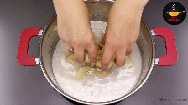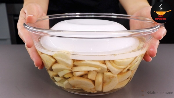 У миску наливаємо 1 л холодної води і додаємо 1 ст.л. соди. Перемішуємо до повного розчинення соди і висипаємо сюди підготовлені шматочки яблук.