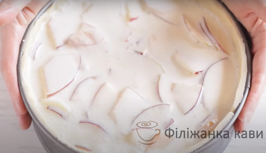 Викладаємо у форму яблука, розрівнюємо та заливаємо сметанною заливкою.