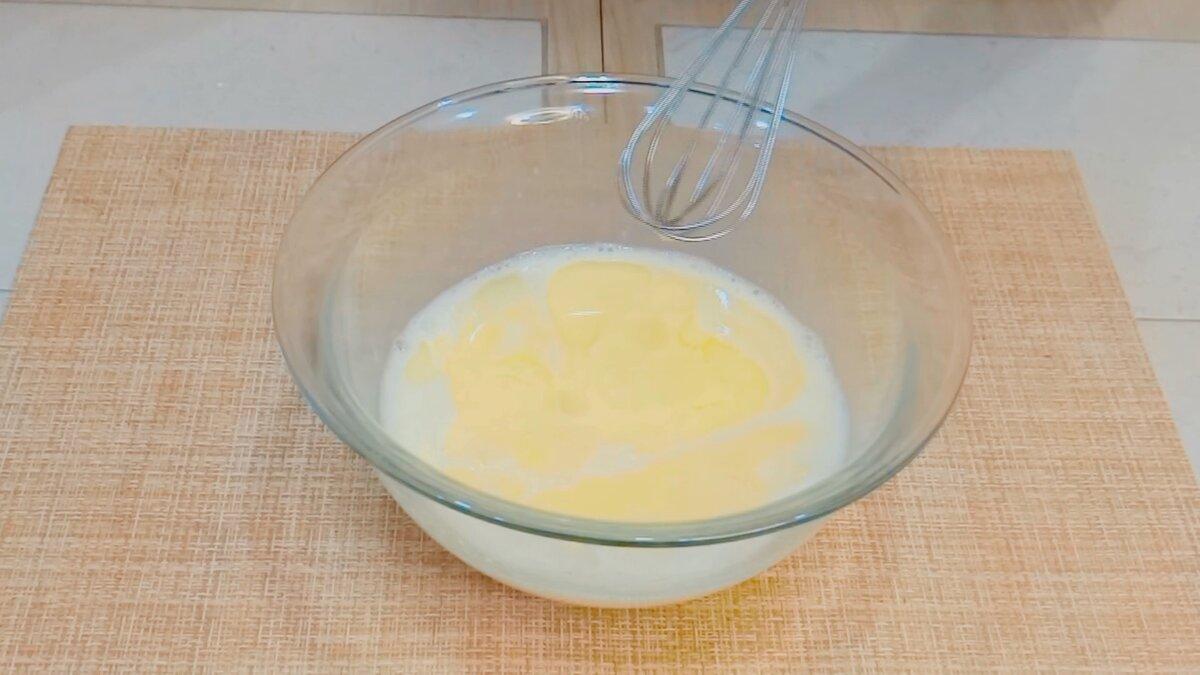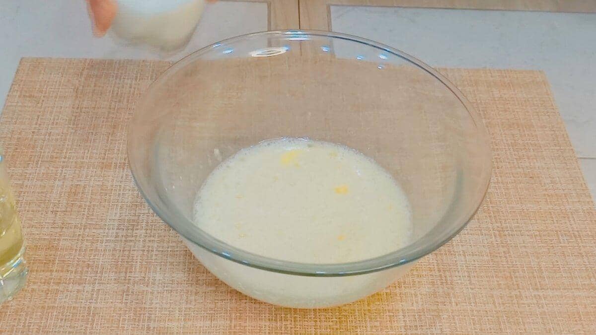 Додаємо молоко і вливаємо олію, перемішуємо.