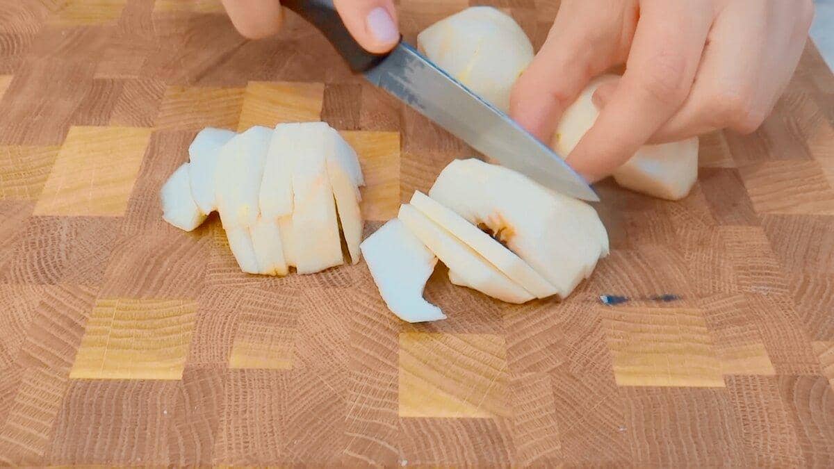Очищені від шкірки і серцевини половинки 2 яблук ріжемо на часточки.