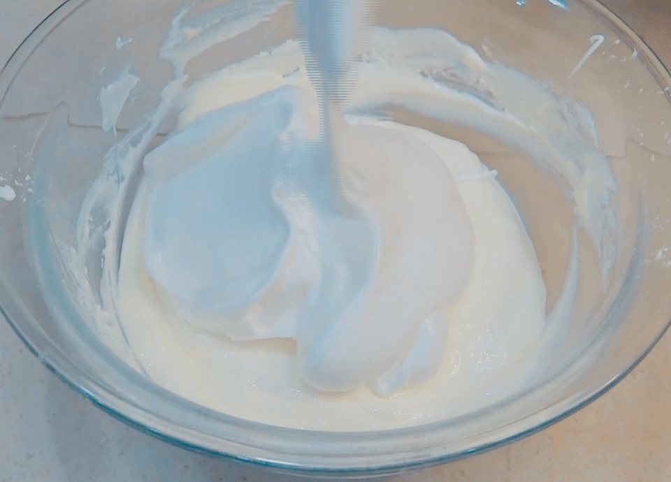 Окремо з’єднуємо сир зі сметаною, всипаємо ванілін і крохмаль. Додаємо збиті білки і акуратно перемішуємо.