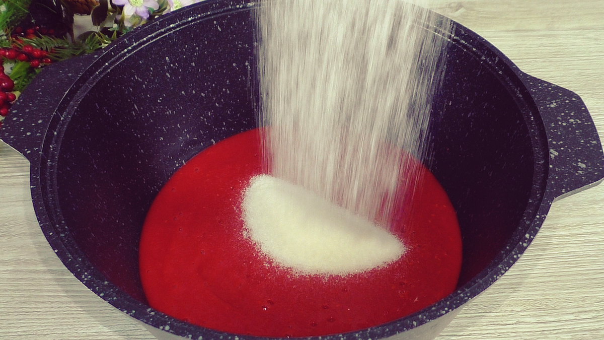 Додати цукор, поставити каструлю з ягідною масою на вогонь, постійно помішуючи довести до кипіння, води додавати не потрібно.