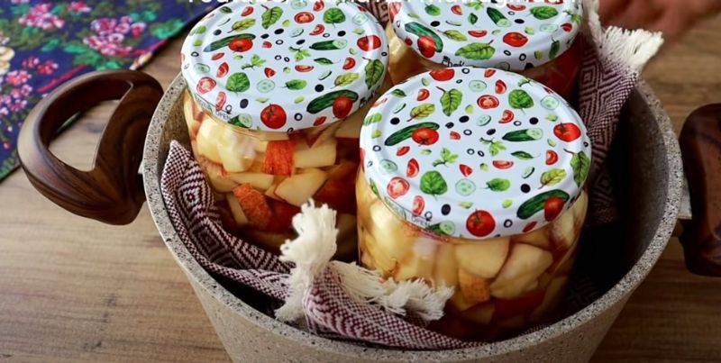- Накриваємо кришками, збовтуємо, щоб цукор розчинився і ставимо банки в каструлю на рушник.