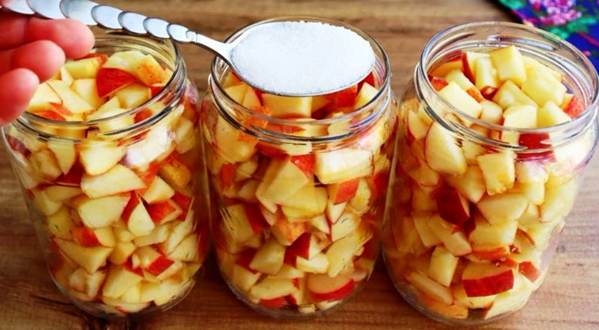 - Розкладаємо по банкам до верху і насипаємо по столовій ложці цукру.