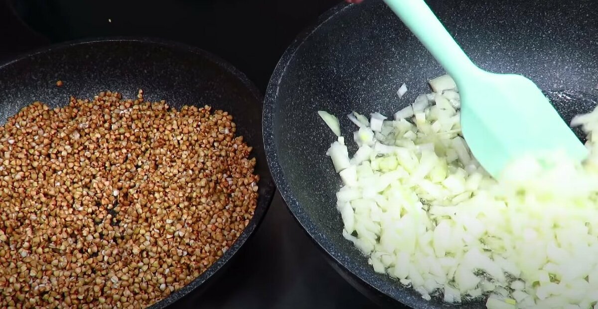 Заздалегідь промиту гречку викладаємо на суху сковороду і обсмажуємо, постійно помішуючи. Робимо це кілька хвилин, поки гречані зернятка не почнуть клацати. Обсмажена гречка – набагато смачніша і розсипчаста. Паралельно обсмажуємо ріпчасту цибулю і часник на інший сковороді.