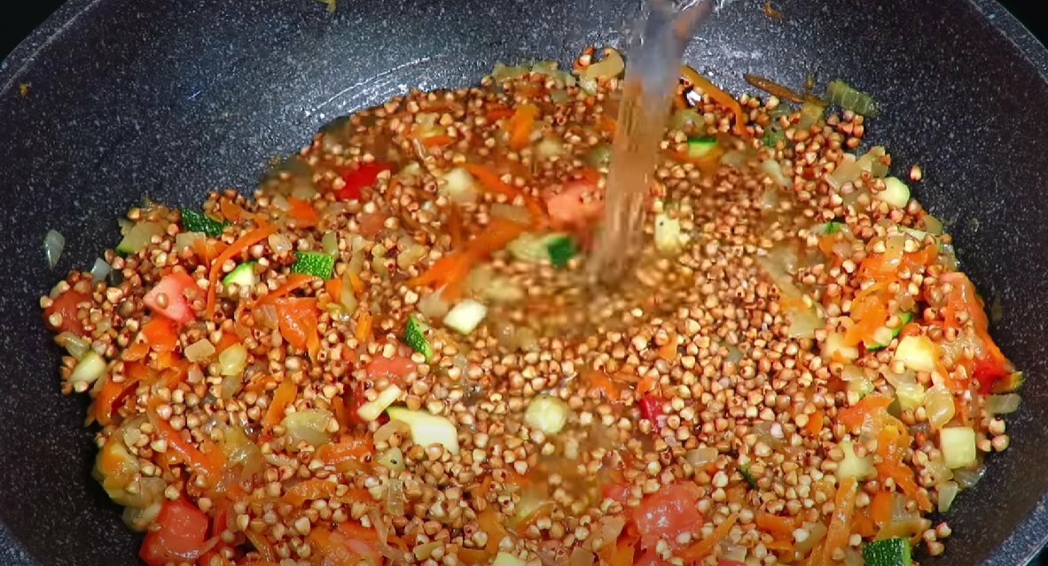 Обсмажену гречану крупу перекладаємо до овочів. Заливаємо водою і тушкуємо під кришкою 15 хвилин.