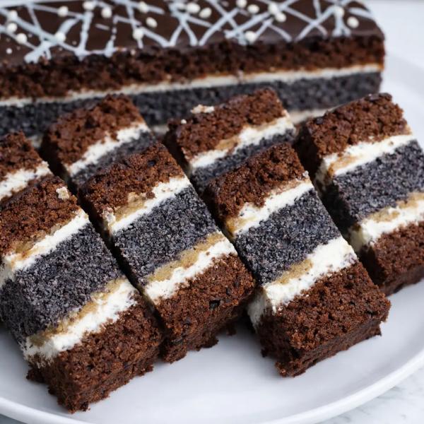 Чорний корж+крем(заварний)+тушені яблука+ маковий корж+крем+яблука+чорний корж.