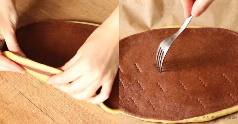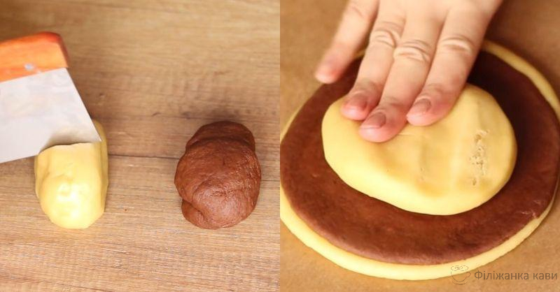 Біле та шоколадне тісто розділіть навпіл. Половинку білого тіста розкачайте на пергаменті у пласт. Поверх нього покладіть і трохи розтягніть шоколадне тісто.