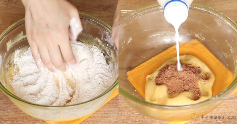 Розділіть тісто навпіл. Половину перемістіть в окрему миску. Туди ж додайте молоко, корицю та какао. Змішайте їх із тістом до однорідності.