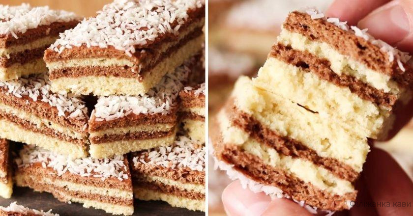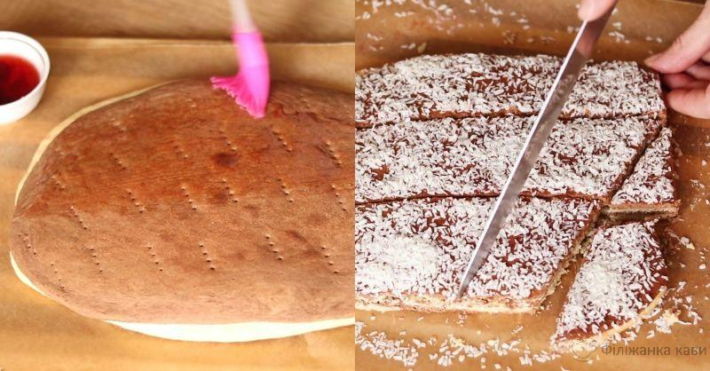 Готовий корж змастіть рідким варенням за допомогою пензлика. Підійде також згущене молоко та мед. Посипте корж кокосовою стружкою та наріжте ромбиками. Готово!