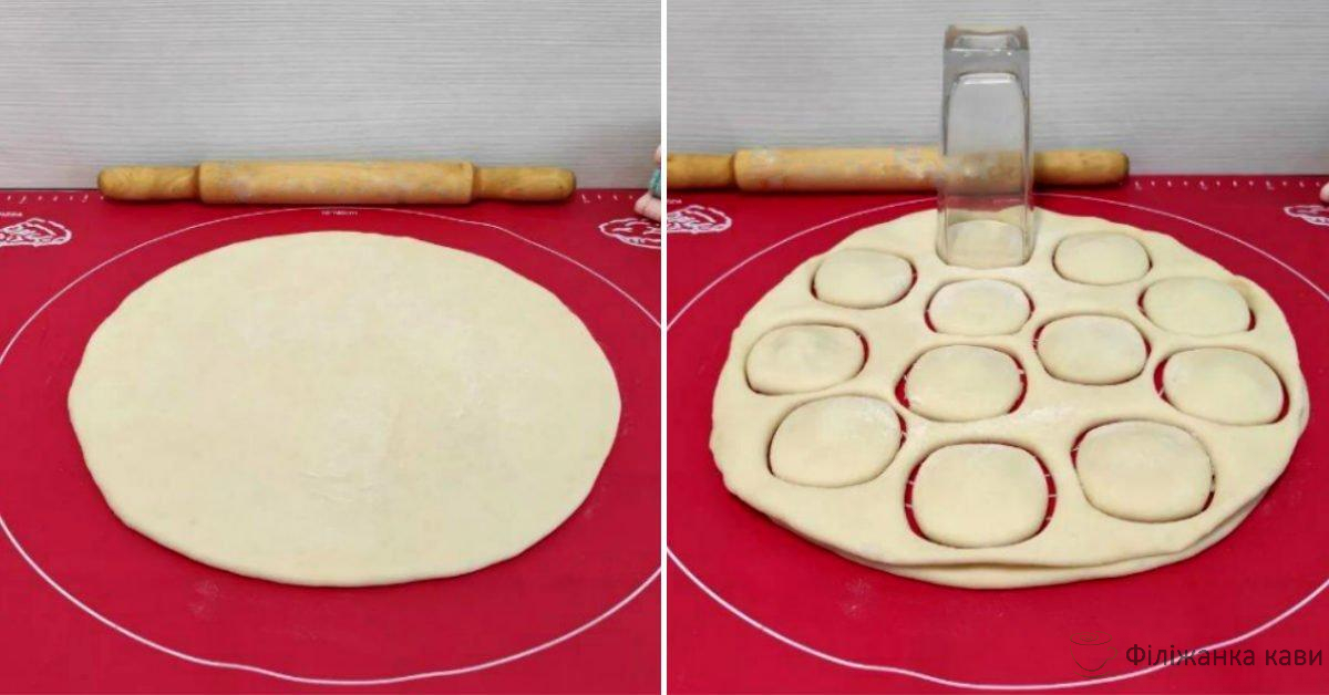 Накрийте пласт зі згущеним молоком іншим пластом. Місце розташування начинки легко визначити по опуклостях. За допомогою склянки чи чашки виріжте кола.