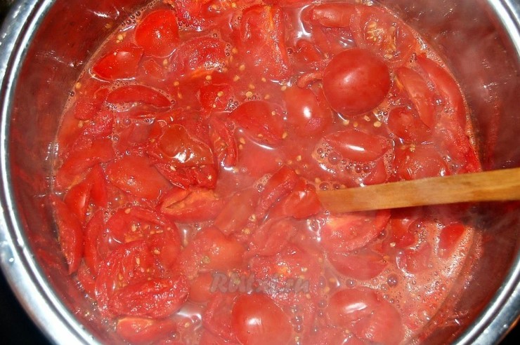 - Ставимо каструлю на газ, чекаємо, доки помідори закиплять, помішуючи. Варимо помідори хвилин 15, за цей час вони добре розваряться, дадуть сік і в ньому плаватимуть.
