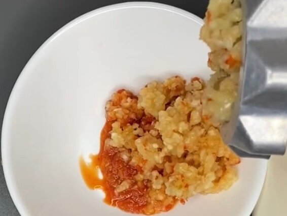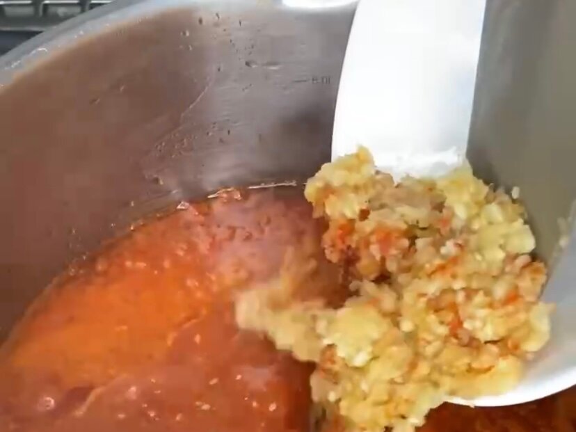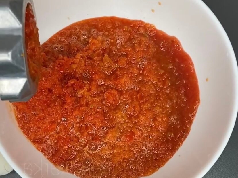 Загальний обсяг очищених від насіння перців повинен становити 1 кг. Пропускаємо через м’ясорубку.