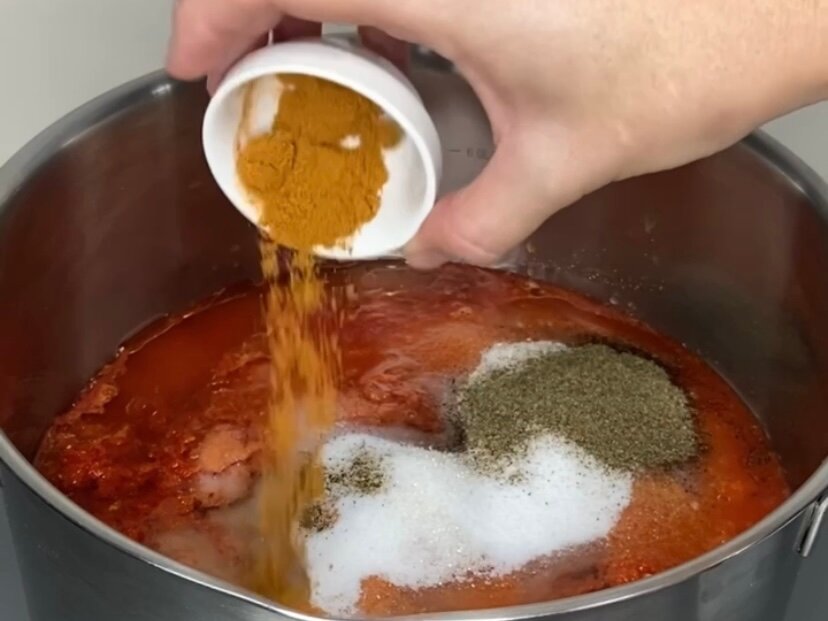Вливаємо олію без запаху, всипаємо сіль, цукор, чорний мелений перець, червоний ( гострий ) мелений перець.