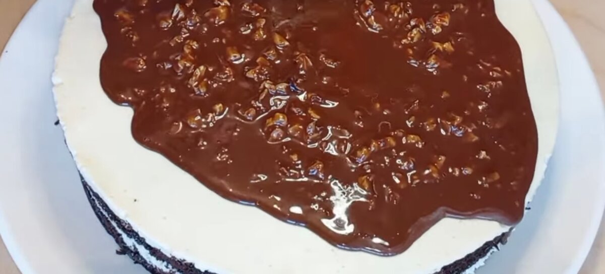По бажанню! Шоколад заливаємо молоком і додаємо трохи вершкового масла. Розтоплюємо, перемішуємо, всипаємо горіхи подрібнені і перемішуємо. Поливаємо готовий торт.