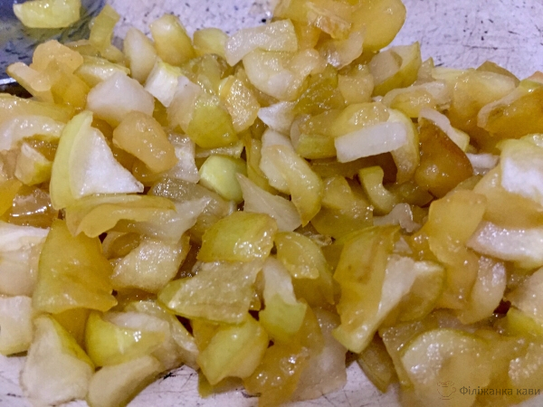 Нарізаємо кубиками, викладаємо в сковорідку. Додаємо цукор і тримаємо на вогні, поки яблука не стануть м’якими ( помішуємо ). Стежимо, щоб шматочки не втратили форму.