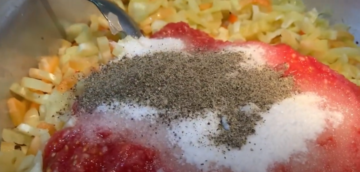 7) Додаємо перець болгарський, помідори з часником, цукор, сіль, перець чорний, перемішуємо, додаємо лавровий лист і оцет, доводимо до кипіння і варимо 25 хвилин.