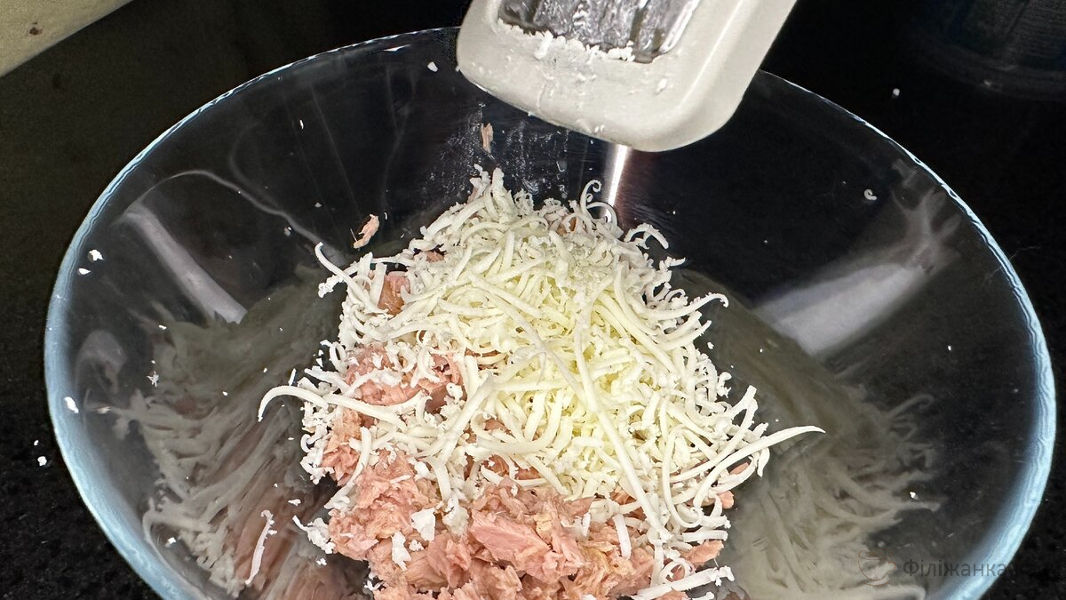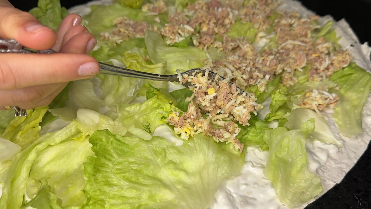 Поверх салату викладаємо рибну начинку.