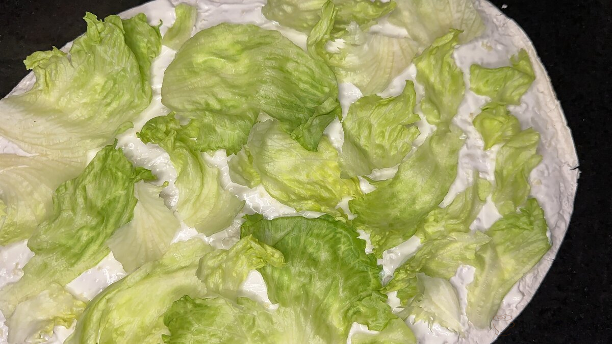 100 грамів салату « Айсберг » потрібно порвати на невеликі шматочки. Замість салату « Айсберг » можна використовувати пекінську капусту. Але буде не так ніжно і повітряно. Її потрібно буде порізати.
