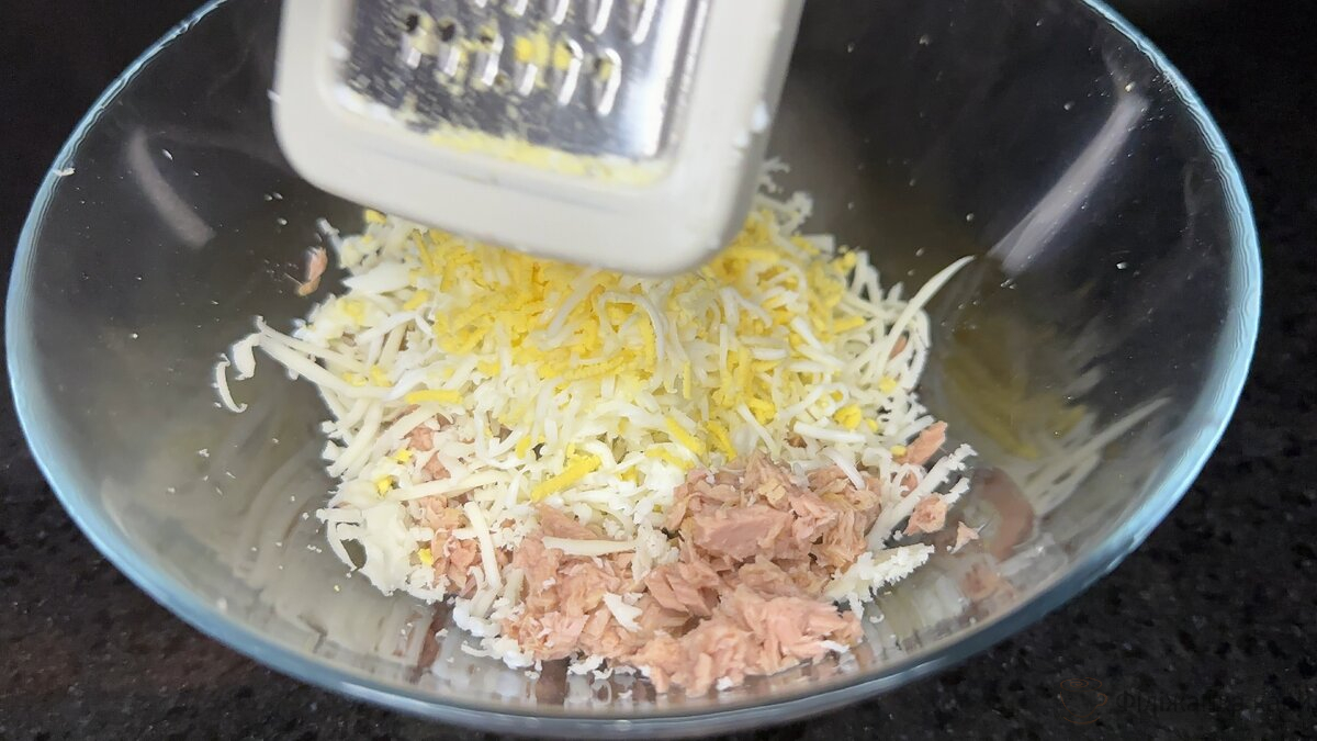До нього додаю протертий сир, і сюди ж потрібно натерти на середній терці 2 варених яйця. Перемішуємо і таким чином отримуємо нашу начинку.