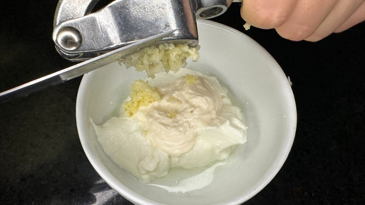 Змащувати лаваш я рекомендую сумішшю сметани, майонезу і часнику. В окрему миску відправте 2 столових ложки майонезу і додайте до нього 3 зубчика пропущеного через прес часнику. Перемішуємо – соус готовий.
