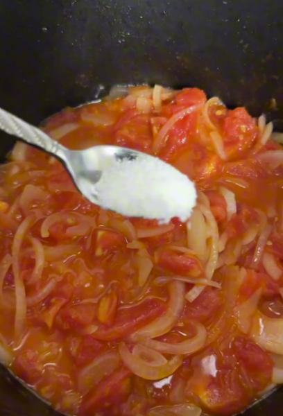 Кладемо в сковорідку змащену олією, додаємо половину столової ложки солі. Обсмажуємо до тих пір, поки помідори стануть пюре.