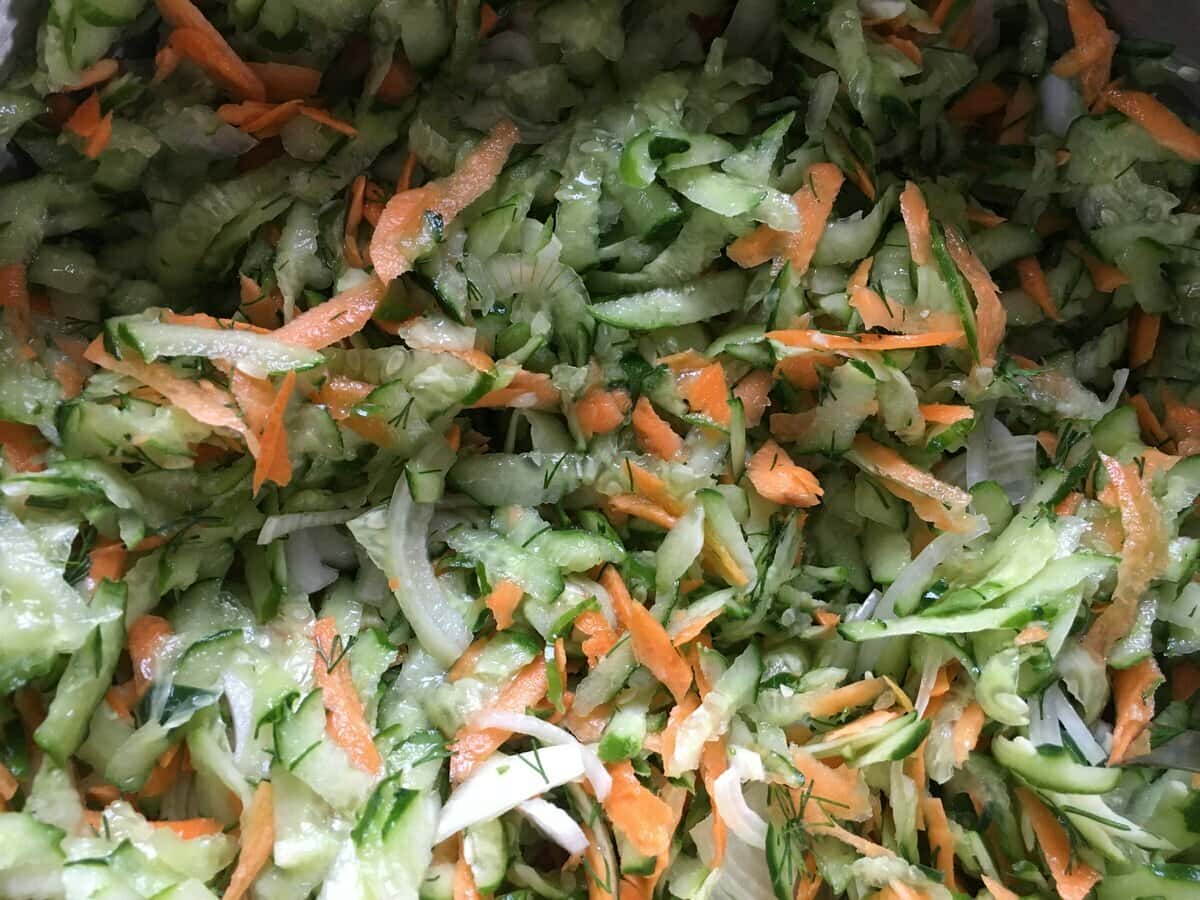 Якщо у огірків груба шкірка, її краще очистити. Якщо насіння вже великі і грубі, їх потрібно видалити. Моркву очищаю. Огірки і моркву натираю на великій терці. Якщо хочете — натріть на корейській терці.