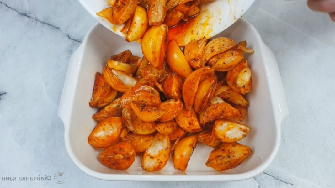 Після того, як цибуля замаринується, беремо форму для запікання і змащуємо олією. Перекладаємо в форму.