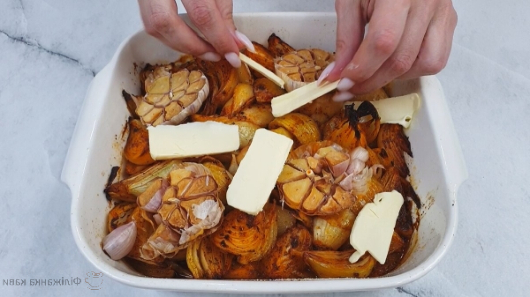 Потім дістаємо цибулю з духовки і поверх шматочки вершкового масла.