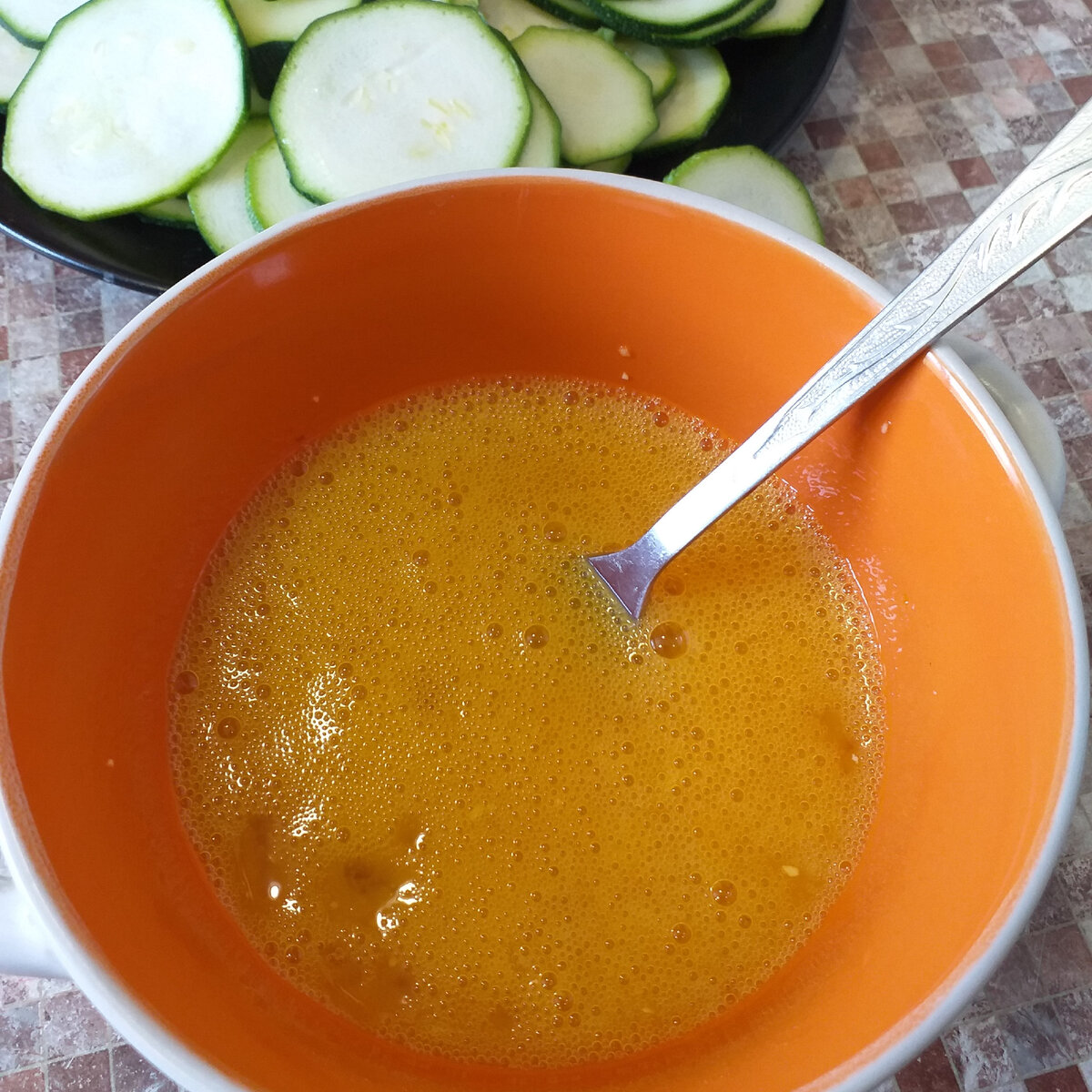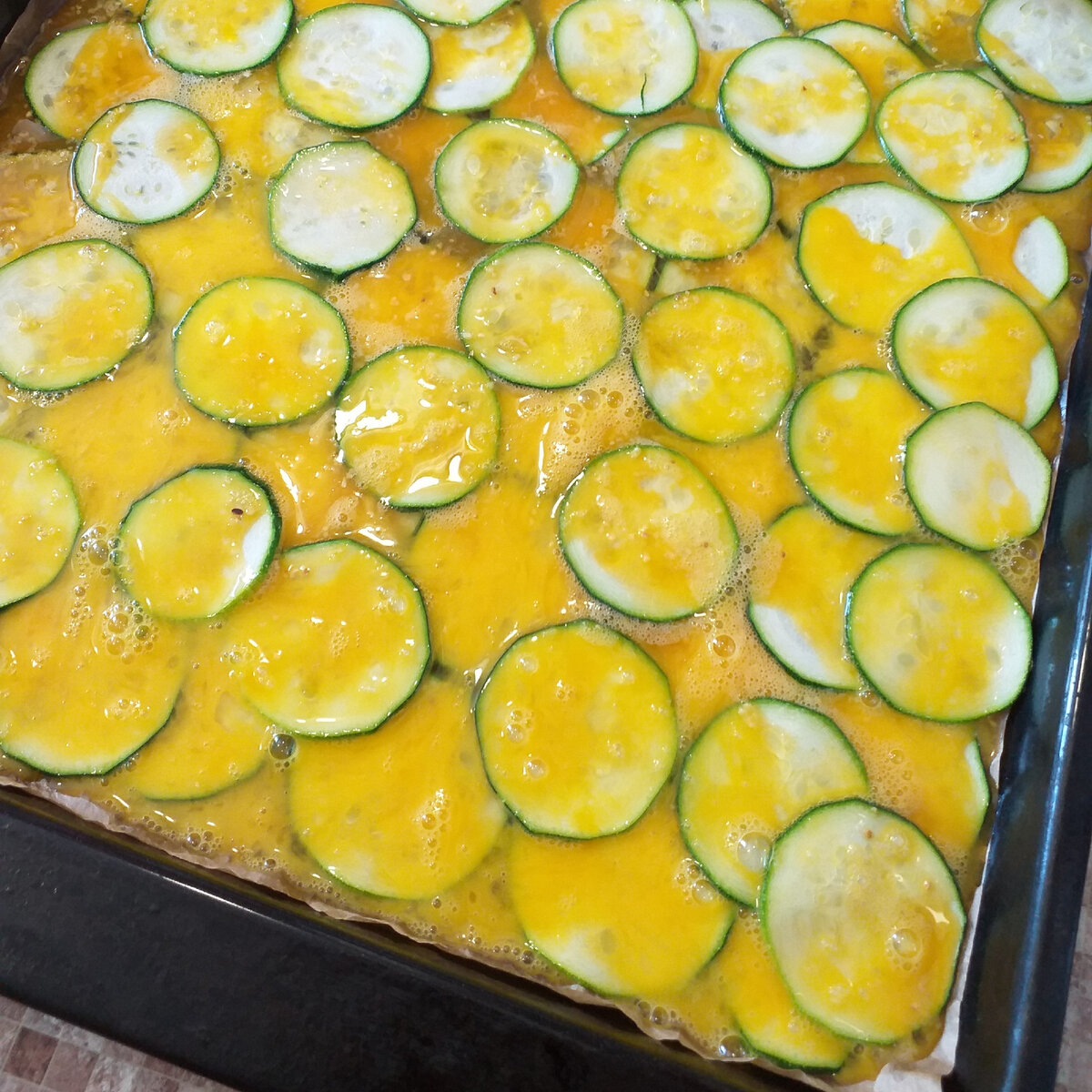 ✅ Кабачки заливаємо яйцями і розділимо їх рівним шаром по всій поверхні.