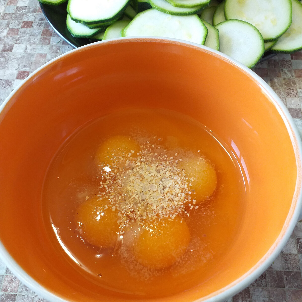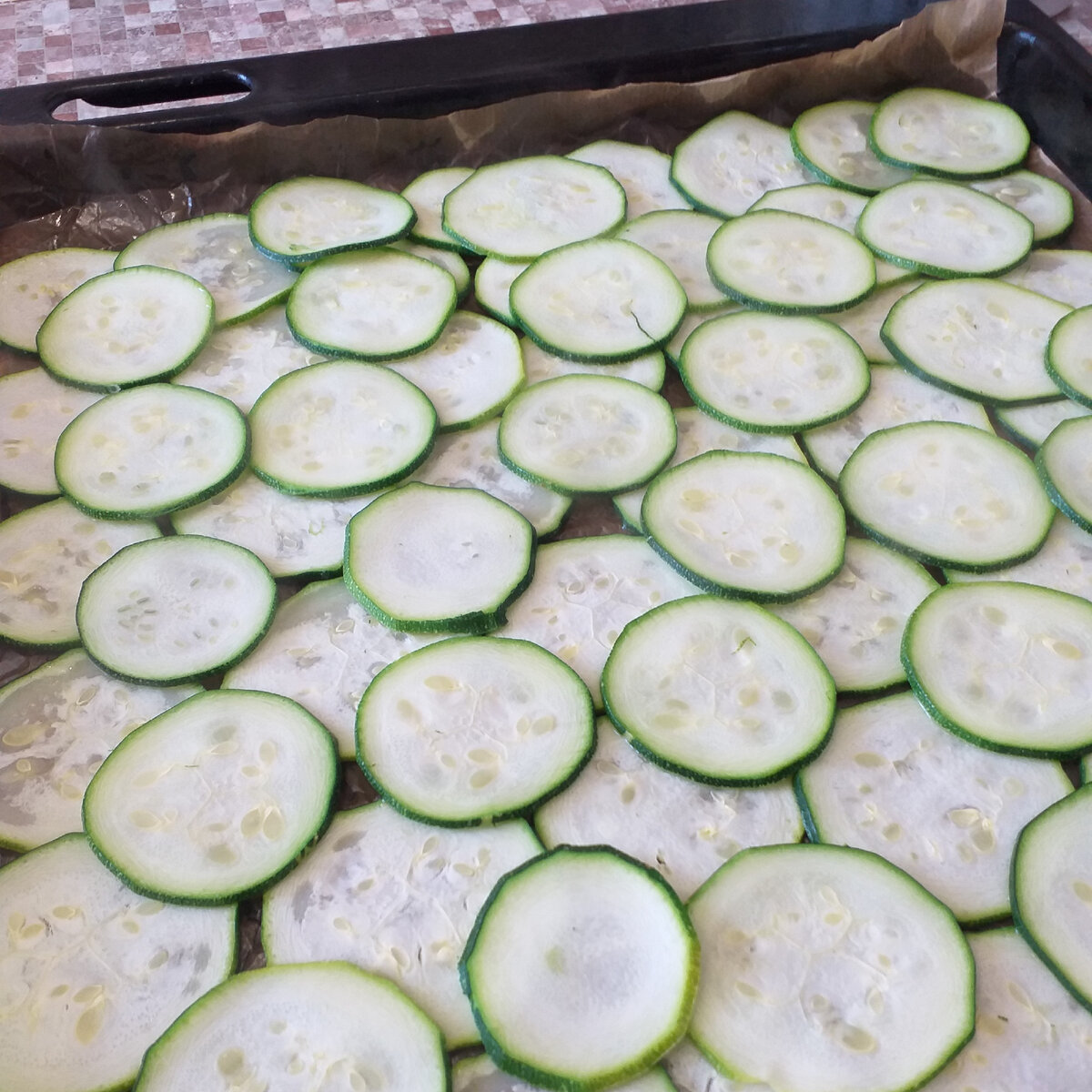 ✅ На силіконовий килимок викладаємо кружечки кабачків ( можна одним шаром або як показано на фото нижче ).