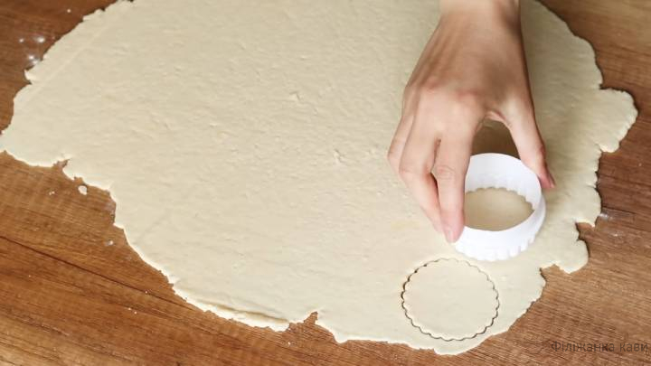 Розкачати тісто в тонкий пласт, вирізати склянкою або формою кружки. Обрізки тіста знову зібрати в грудку, розкачати і ще вирізати.